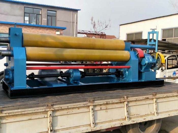 不銹鋼鋁板專用卷板機,表面掛聚氨酯,可以防止表面有劃痕. 該機結構型式為三輥對稱式,上輥在兩下輥 對稱位置作垂直升降運動,通過絲桿絲母蝸桿傳動而獲得,兩下輥作旋轉運動,通過減速機的輸出齒輪與下輥齒輪嚙合,為卷制板材提供扭矩。上輥可分離取料電動升降起輥。可安裝靠輪卷制錐體、角鐵、槽鋼等異異型鋼材。